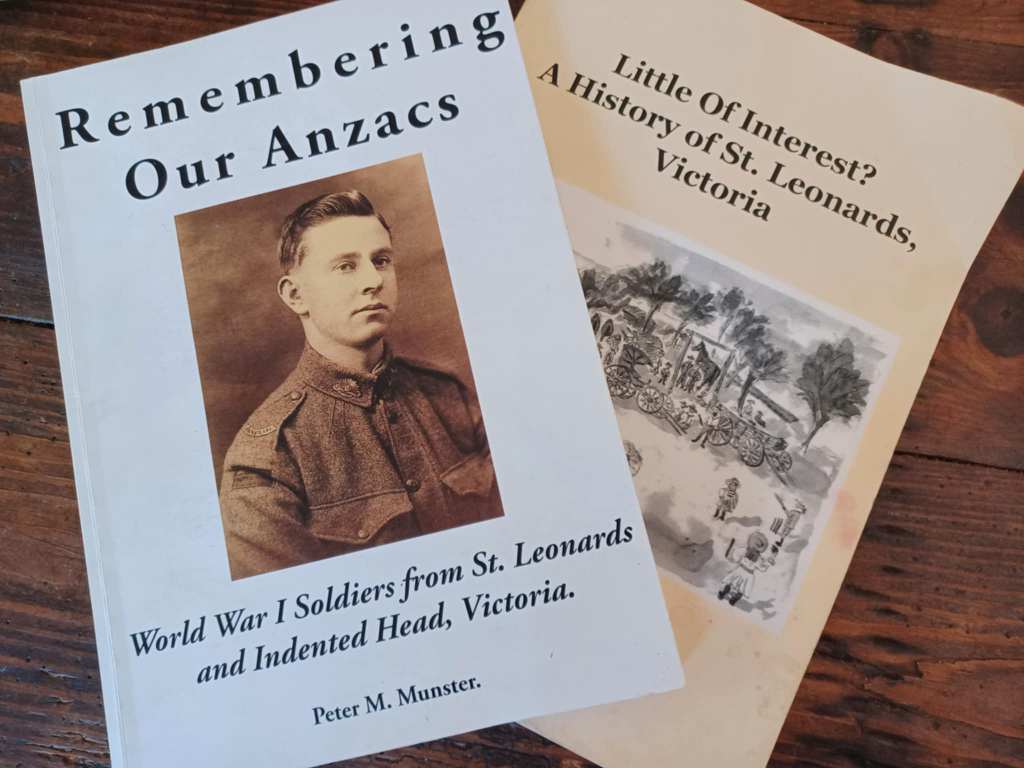 Copies of Remembering Our Anzacs, World War 1 Soldiers from St. Leonards and Indented Head, Victoria2011, and Little Of Interest? A History of St. Leonards Victoria2013 by Peter M. Muster can be purchased at St Leonards Scoops News and Post or through the St Leonards Progress Association.