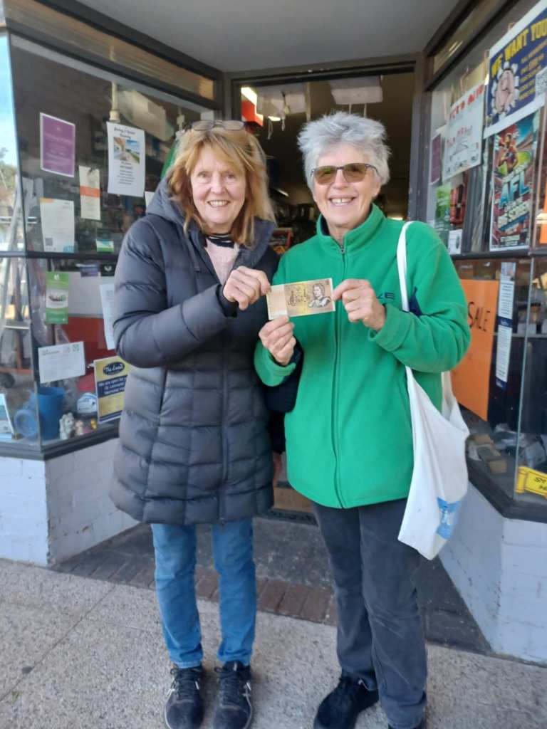 Photo: Beth and Una Wright (Jean Rigby’s daughter) holding the $1 note from their first sale at the new hardware shop.